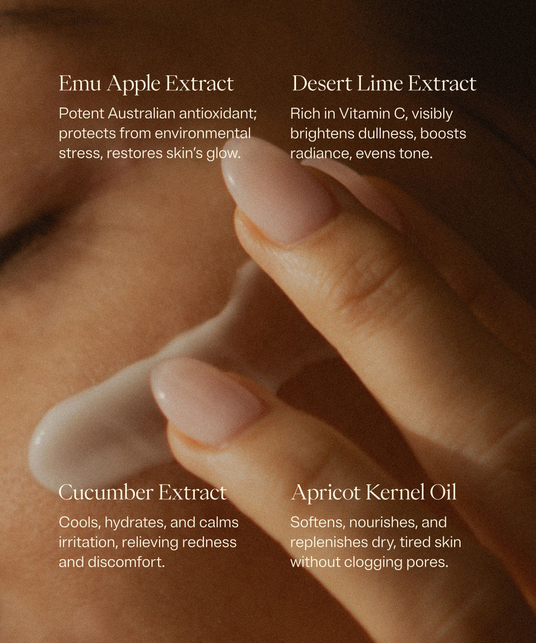 ( KAKADU PLUM ) Nature's richest source of vitamin C. Helps brighten skin, even out skin tone, and stimulate collagen production.