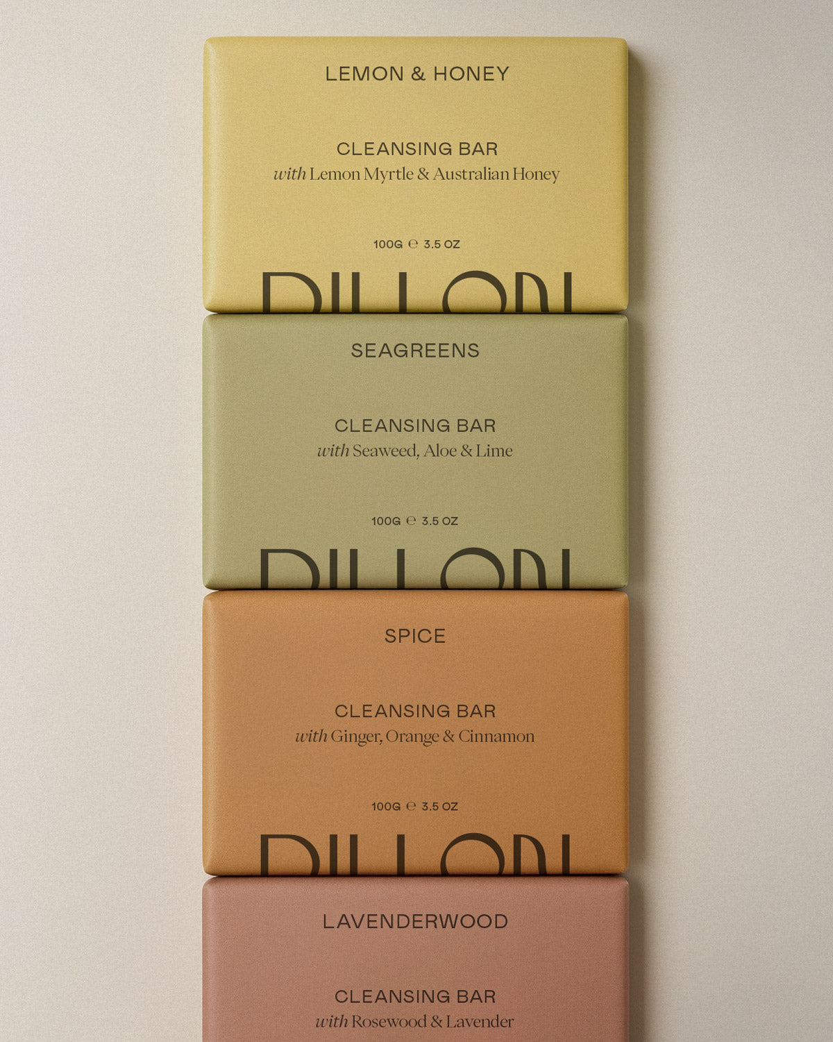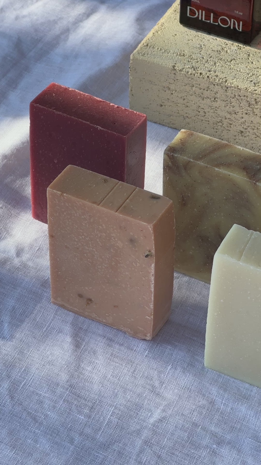 Four Dillon soap bars of different colors stacked on a textured gray surface